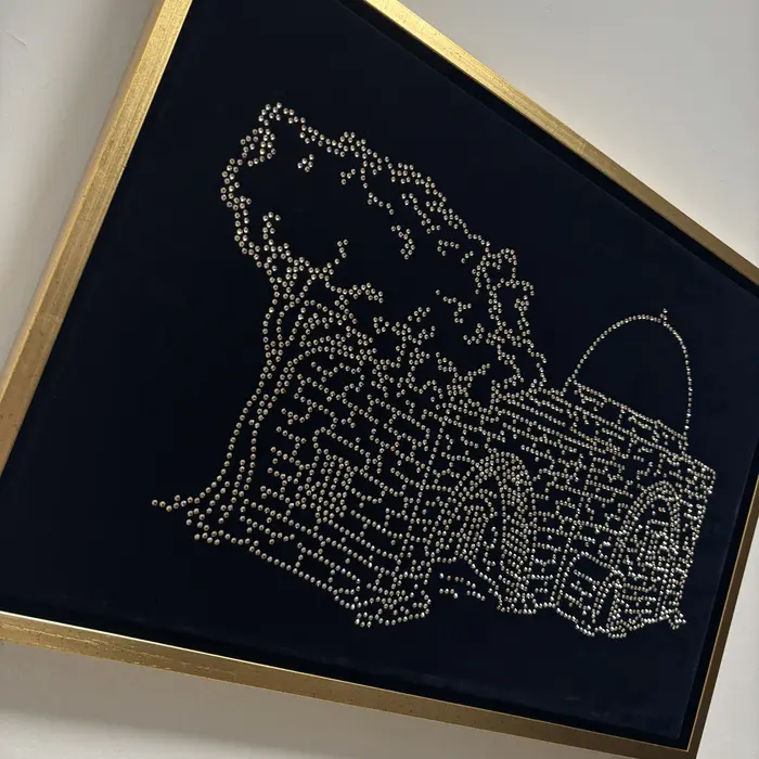- אבני הסברובסקי משובצות על גבי בד קטיפה יוקרתי בגוון עמוק, בשילוב קנווס עם אפקט תלת מימדי.